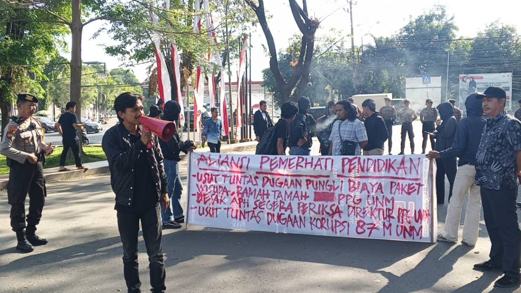 Makassar, Lapagala.com – Aliansi Pemerhati Pendidikan Sulawesi Selatan kembali menggelar aksi unjuk rasa jilid 2, Selasa (23/7/2025), di depan Kantor Kejaksaan Tinggi Sulsel dan Mapolda Sulsel. Aksi ini merupakan bentuk desakan keras agar aparat penegak hukum segera mengusut dugaan praktik pungutan liar (pungli) dan penyimpangan anggaran di lingkungan Program Pendidikan Profesi Guru (PPG) Universitas Negeri Makassar (UNM).