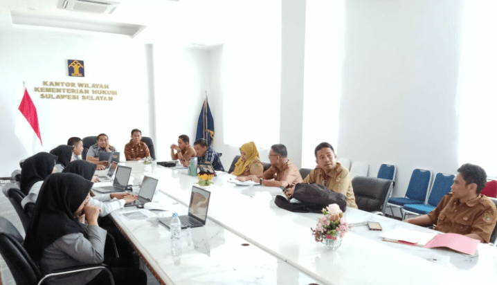 Mereka berdiskusi dengan tim perancang peraturan perundang-undangan Kanwil Kemenkumham Sulsel terkait enam ranperbup, yakni: