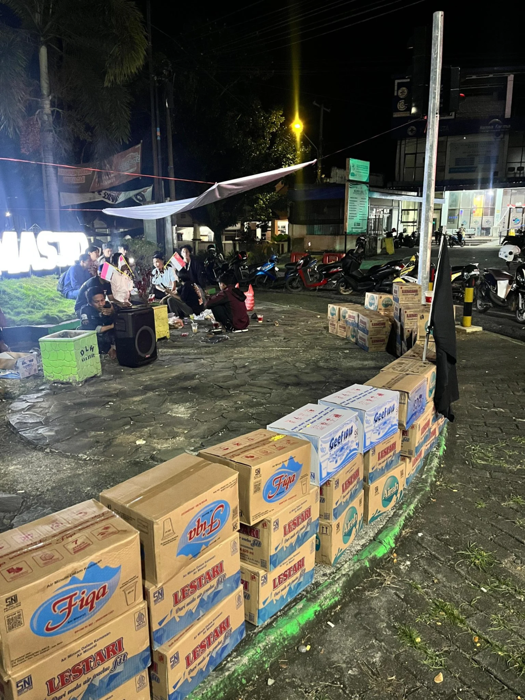 Pantauan di lapangan, tumpukan kardus berisi air minum terlihat di sekitar perempatan Jl. Ahmad Yani–Hos Cokro. Sejumlah mahasiswa duduk melingkar dan berdiskusi di posko yang dijadikan pusat pengumpulan donasi.