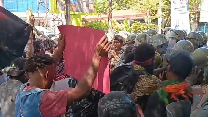 Aksi yang digelar di depan Asrama Mahasiswa Papua ini sempat diwarnai saling dorong antara massa dengan aparat kepolisian. Meski begitu, situasi tetap kondusif dan tidak berujung ricuh.