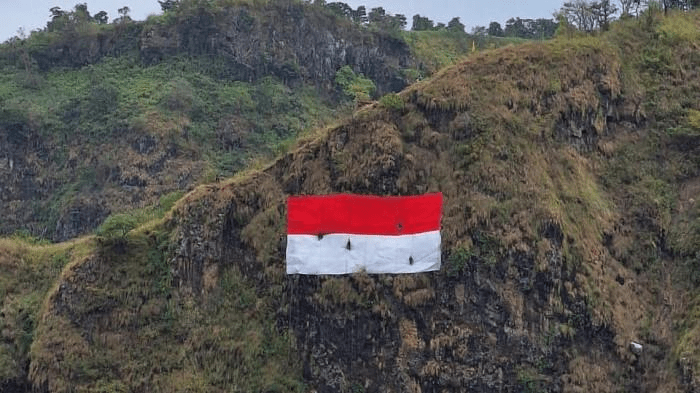 Jeneponto, Lapagala.com – Mahasiswa Pecinta Alam (Mapala) 45 Universitas Bosowa (Unibos) Makassar melakukan aksi pengibaran bendera merah putih raksasa berukuran 25 x 15 meter di kawasan wisata alam Bossolo, Kecamatan Rumbia, Kabupaten Jeneponto, Sulawesi Selatan, Minggu (17/8/2025) pagi.