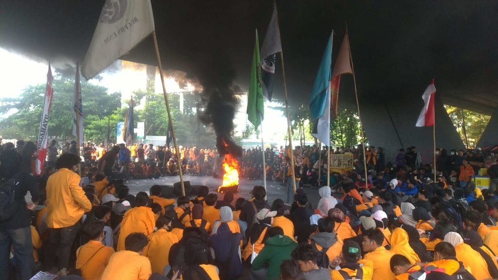 Sekitar pukul 15.20 WITA, ribuan mahasiswa tiba di lokasi aksi sambil bergandengan tangan dan meneriakkan yel-yel, “Revolusi, revolusi, revolusi!” Selang 20 menit kemudian, tepat pukul 15.40 WITA, lebih dari lima ban bekas dibakar di tengah jalan. Asap hitam pekat membubung tinggi, membuat langit Makassar tampak gelap. Akibat aksi blokade jalan ini, arus lalu lintas lumpuh total dan memaksa pengendara mencari jalur alternatif.
